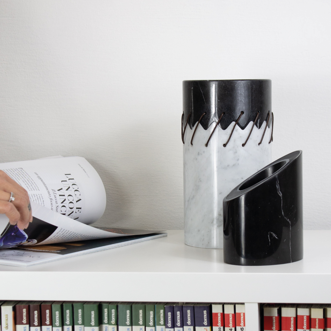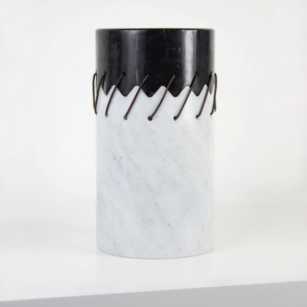 Vaso contenitore realizzato in marmo bianco di Carrara e marmo nero Marquinia. L’incastro a secco delle due essenze di marmo è realizzato con una cucitura realizzata con un laccio di cuoio.